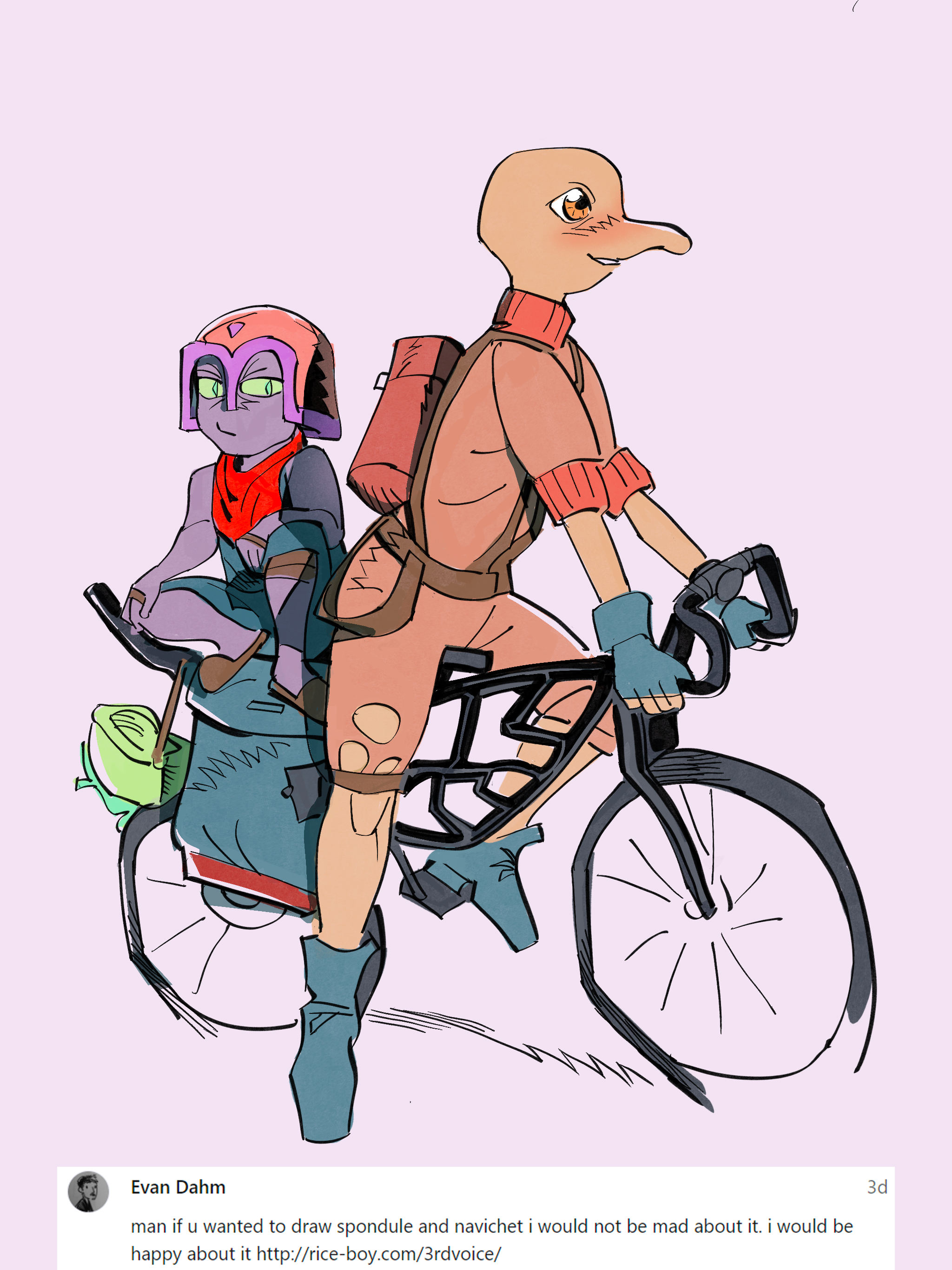 3rd Voice is an ongoing fantasy graphic novel updating with one scene or so a week. It concerns a world in a state of apocalyptic crisis, and the precarious lives of many people therein. It launched in late 2022. Reuben winner, Eisner & Ignatz nominee. Launch Video, 2nd anniversary video.