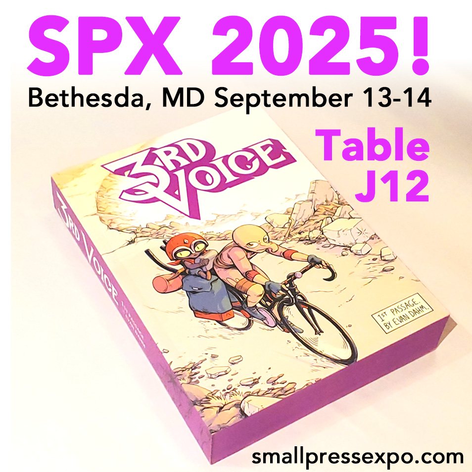 I have been intermittently receiving in-progress PROOF MATERIALS for the 3rd Voice book, did I mention. It is looking good; the purple spot color on the cover and edges of the text block is perfect. I don’t know how to promote such a thing anymore, other than to sort of rely on the regular comic updates as a reminder for people that it exists. anyway I am excited about book. SPX DC SEPTEMBER