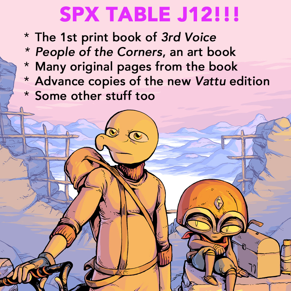 SPX is THIS WEEKEND in Bethesda MD. I am tabling at J12, and this will be the OFFICIAL DEBUT of the 1st 3rd Voice Book. It will be available at Topatoco sometime soon thereafter. ALSO at this show, and probably (???) available online after, is a small riso-printed art book called "People of the Corners" that I am very happy with it; a sort of experiment in risographic printing and fictional-world-internal artifact design.
