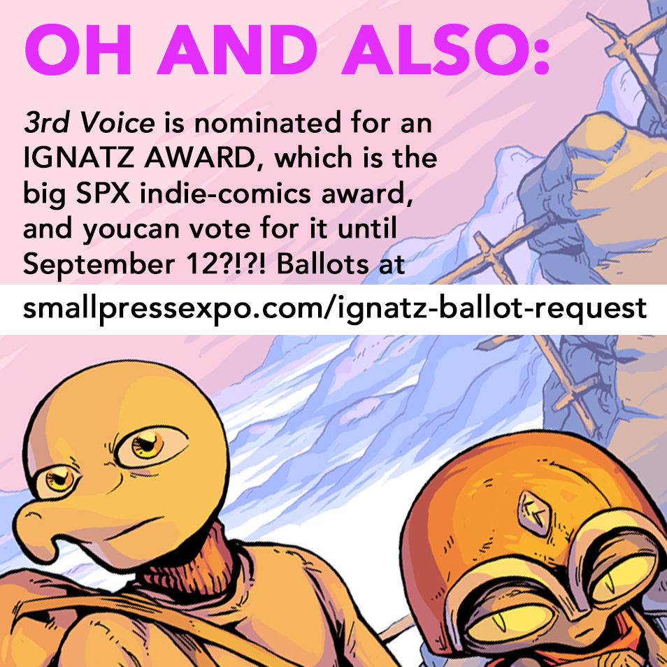 August 18, 2025 3rd Voice is nominated for an IGNATZ AWARD! That is a big comics award for mostly-small-press materials. Anyone can vote, and if you like the thing I am making it would be nice if you voted for it. Very excited to be nominated for this!!!